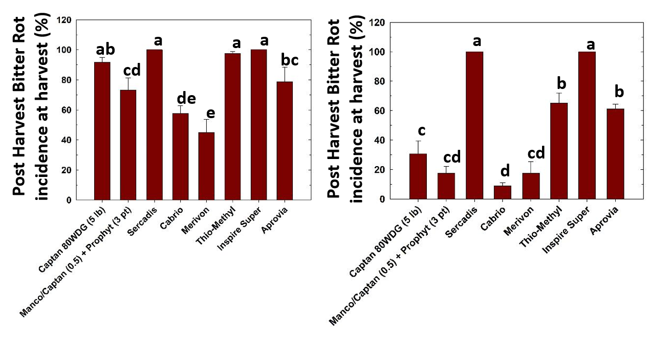 - The final spray prior to harvest, apply Merivon or Pristine (0 day PHI) in tank mixture with a half rate of captan (0 day PHI). The graphs below show postharvest incidence of bitter rot following preharvest fungicide applications every 14 days (graph on left) or 7-10 days (graph on right). Trees were sprayed 1 or 2 days prior to harvest. On extended intervals, Merivon provided significantly better control of bitter rot, and even on 7 to 10 day intervals, pyraclostrobin (one of the actives in Merivon) provided better control of bitter rot than captan alone. If you have resistance to FRAC 11 (strobilurins-Pristine, Merivon, Luna Sensation, Sovran, Flint) apply the high rate of captan if possible prior to harvesting.