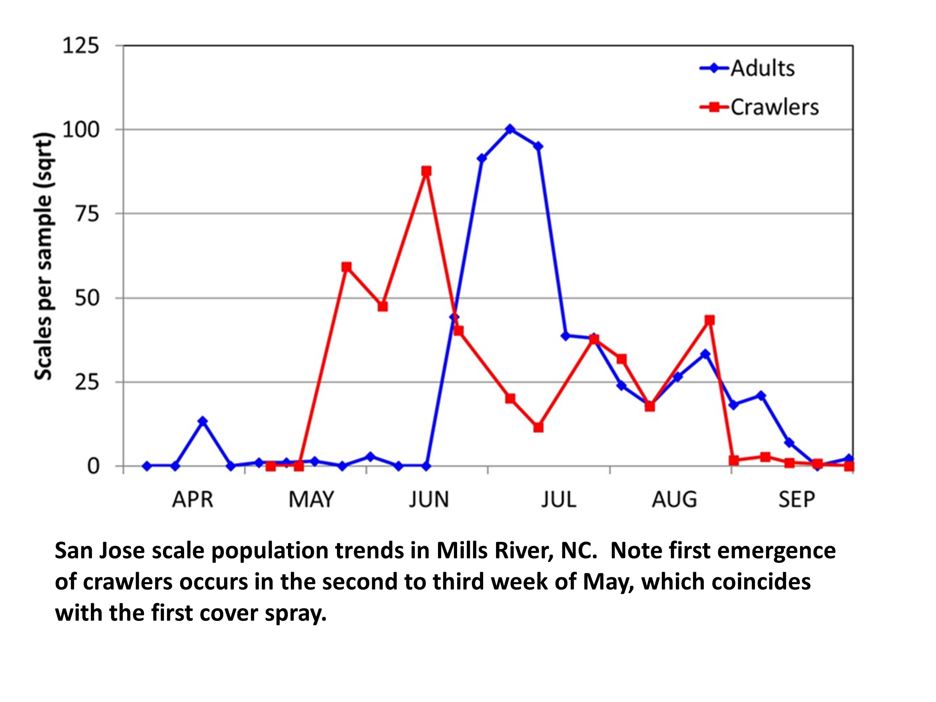 With prebloom Lorsban (chlorpyifos) no longer an option for San Jose scale, greater focus is now placed on timing applications for emergence of first generation crawlers, which occurs near the first cover spray (see figure below).