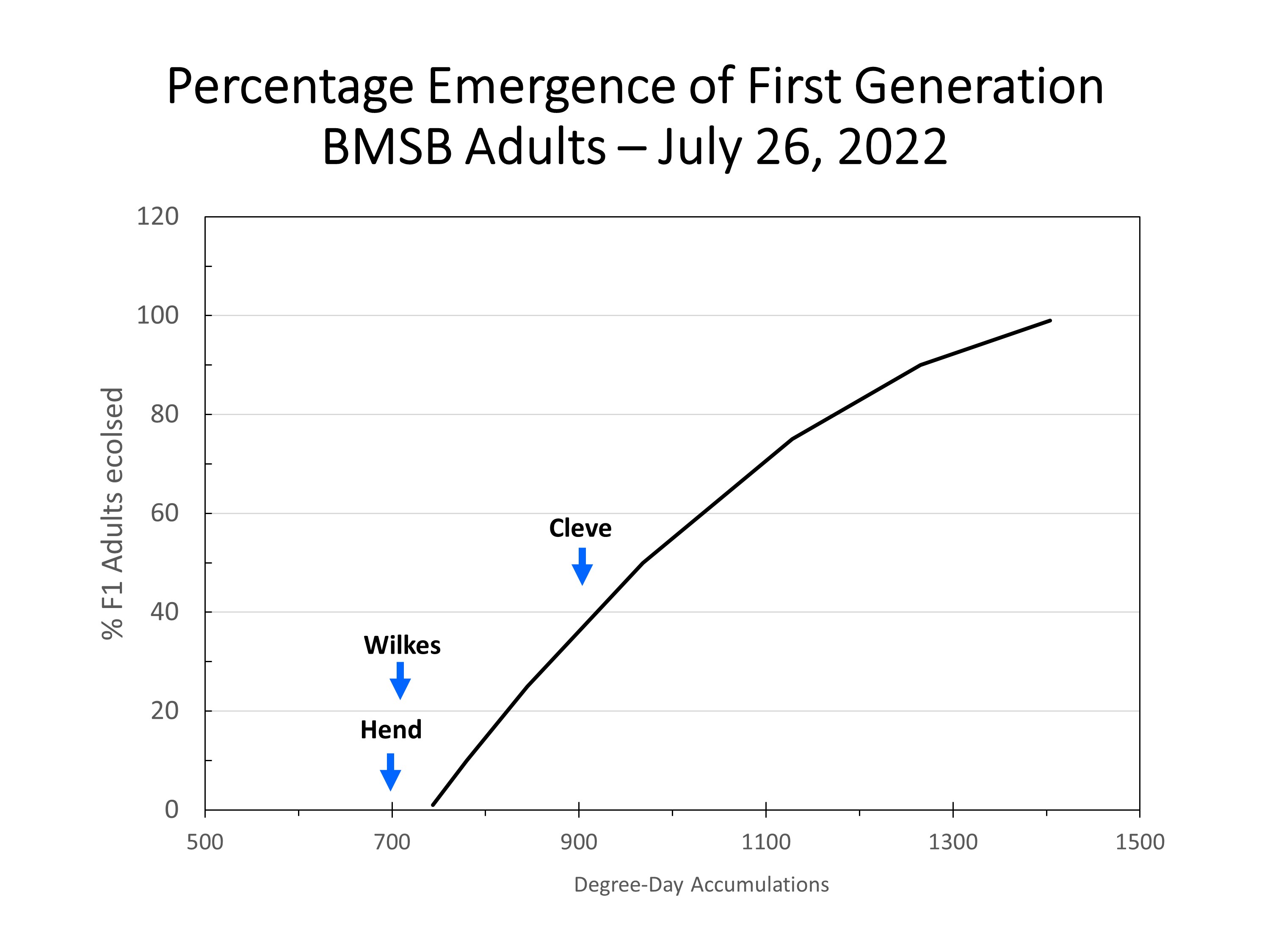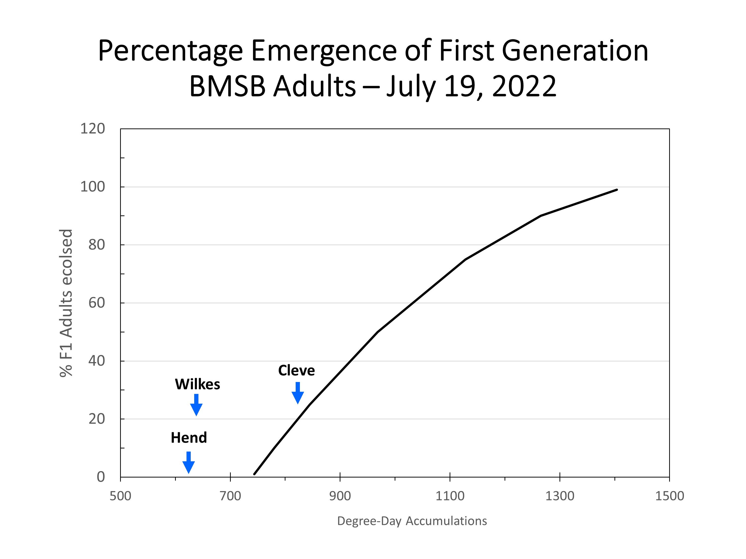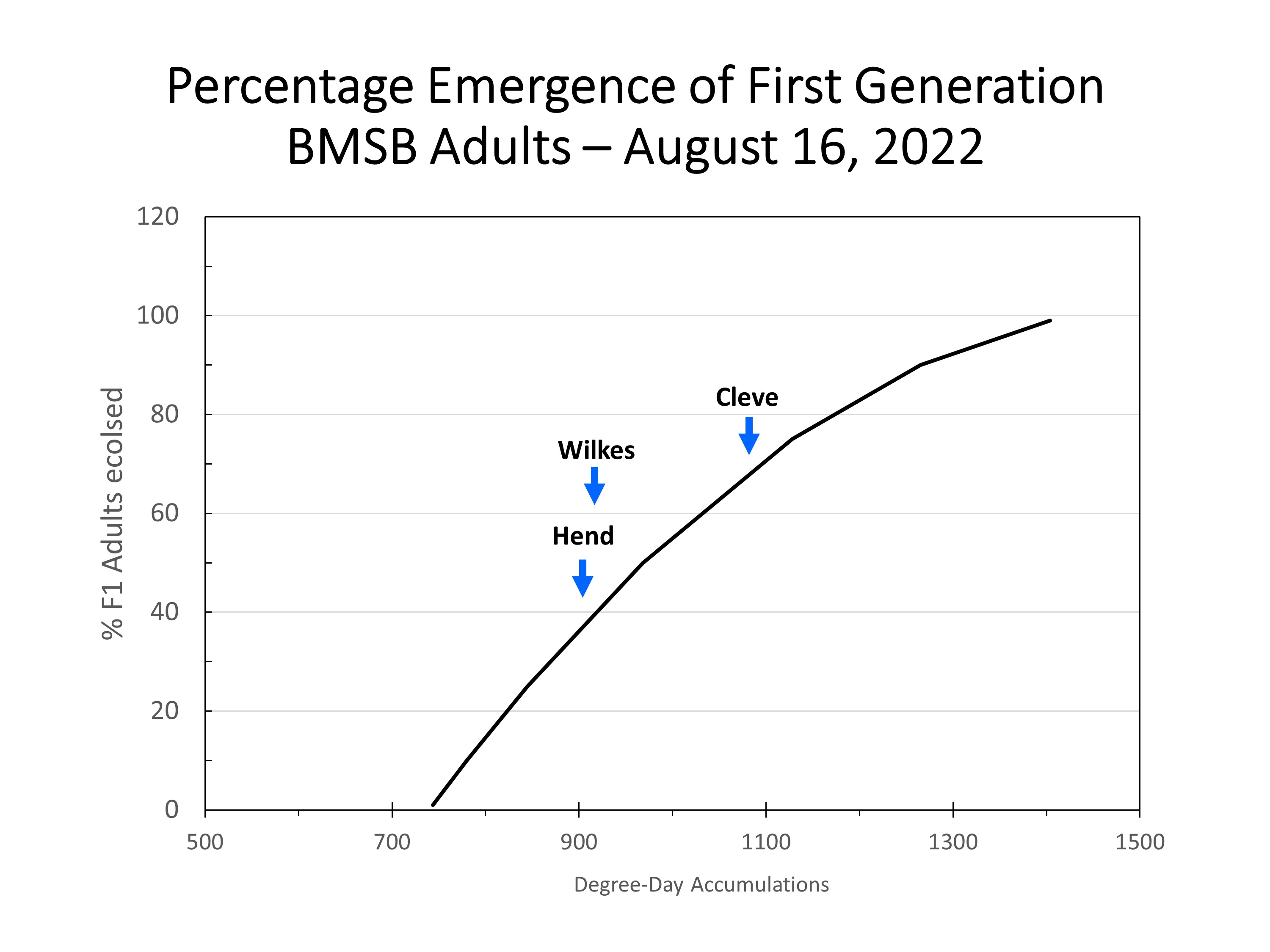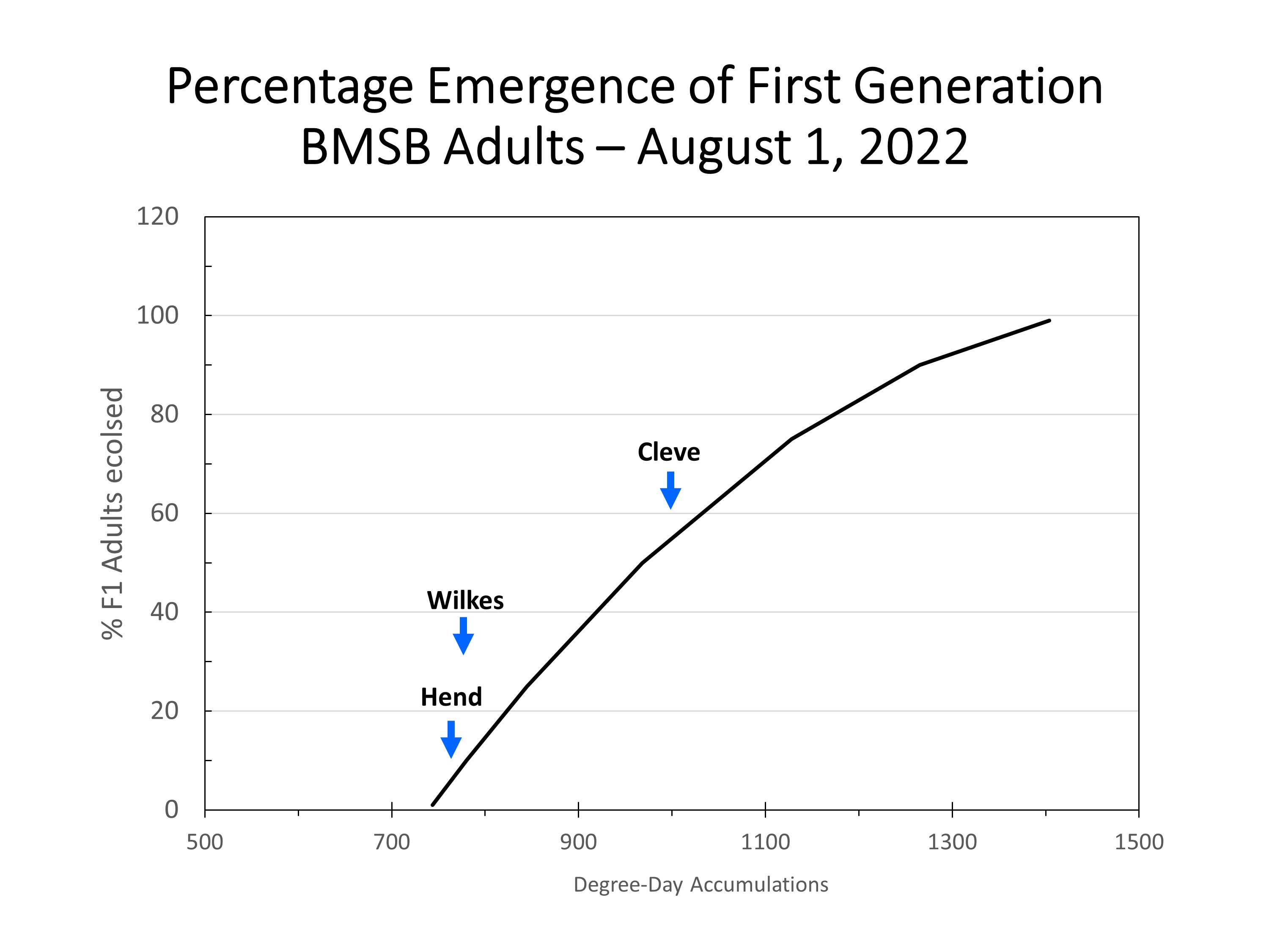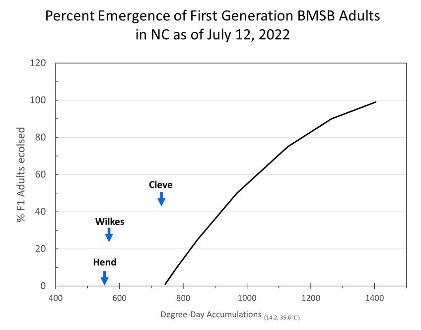 Brown marmorated stink bug on later-maturing cultivars remains the key pest of concern, and will be so for about the next month. Based on degree-day model predictions, first generation adult emergence is approximately 40% complete in Henderson and Wilkes counties, and 70% in Cleveland county. However, pheromone trap captures have been lower than expected to date.