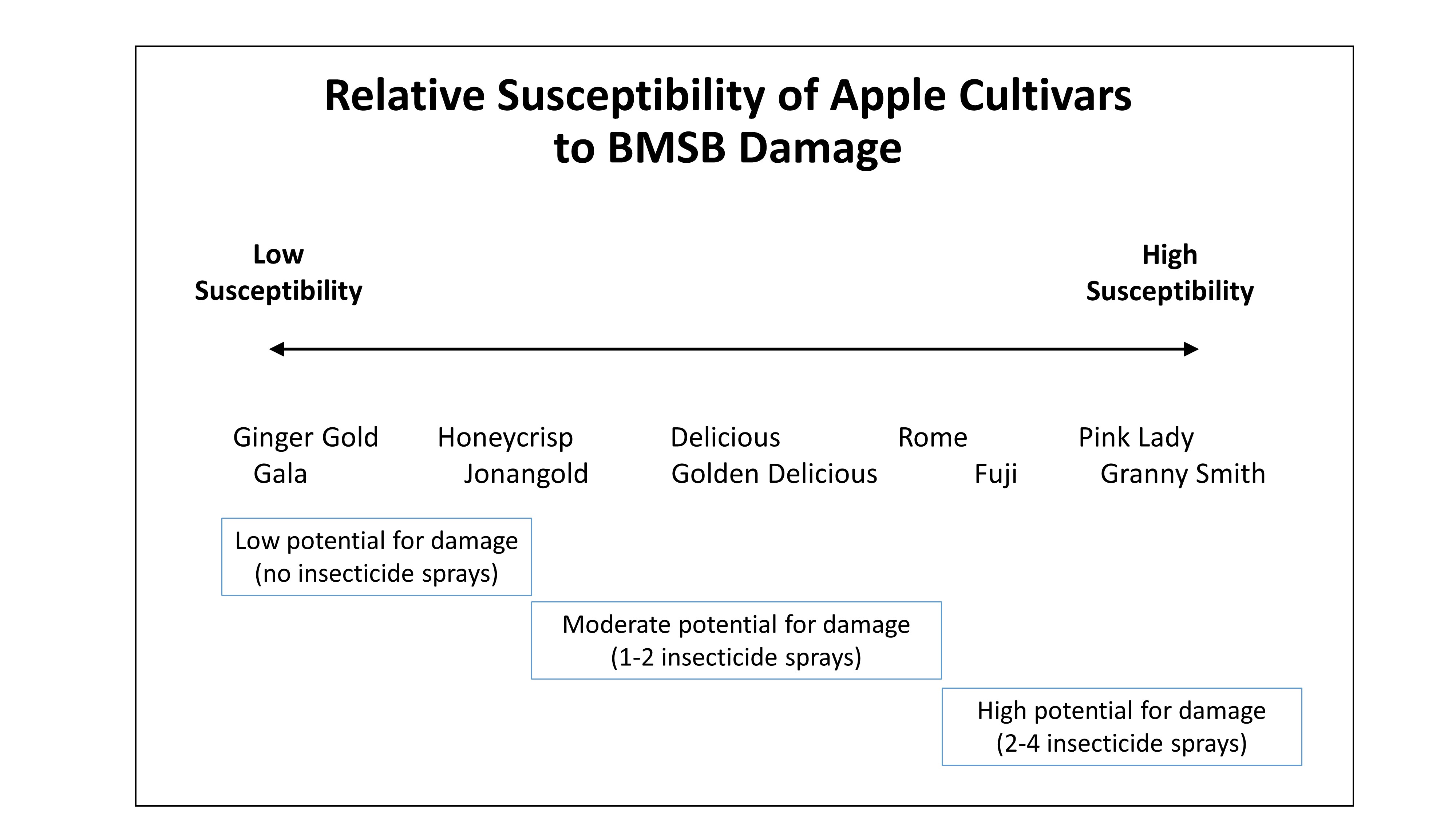 In higher elevations such as Henderson and Wilkes Counties, now is good timing for an insecticide application in orchards with a history of BMSB damage, especially those cultivars with a moderate to high susceptibility (see below). Shown below is a table of relative susceptibility of various apple cultivars to BMSB damage, and the number of insecticide applications typically made to these cultivars. With the exception of Granny Smith apples, which are highly susceptible to damage, insecticides applied at 2-wk intervals up to about 14 days before harvest has worked well. Intervals may need to be shortened to 7 days on Granny Smith when BMSB populations are high.