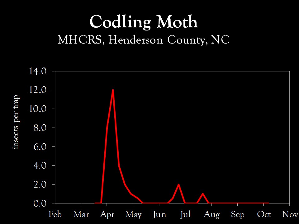 In orchards with moderate to high codling moth populations, an initial insecticide application should be made at 250 DD, which will occur later this week in lower elevation orchards (about 1000 ft). At higher elevations, such as Henderson County (about 2,000 ft), 250 DD is predicted to occur in 8 to 10 days. However, in orchards with low codling moth populations, initial insecticide applications can wait until about 350 DD. Finally, insecticides targeting first generation codling moth are generally not needed in orchards using mating disruption for codling moth, but monitoring with pheromone traps can help determine if a supplemental application is needed.