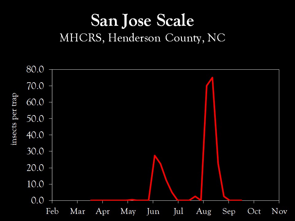 Overall, insect populations are quite low throughout the area. Codling moth and oriental fruit moth trap captures remain low, and there is very little evidence of damaged fruit. Based on model predictions, approximately 50% of first generation brown marmorated stink bug adults have emerged in Henderson and Wilkes Counties, and almost 90% in lower elevations in Cleveland County. However, pheromone trap captures remain surprisingly low. In past years, adult captures were considerably higher at similar DD accumulations. High temperatures during the main egg laying period in mid June and early July may have played a role in suppressing populations.