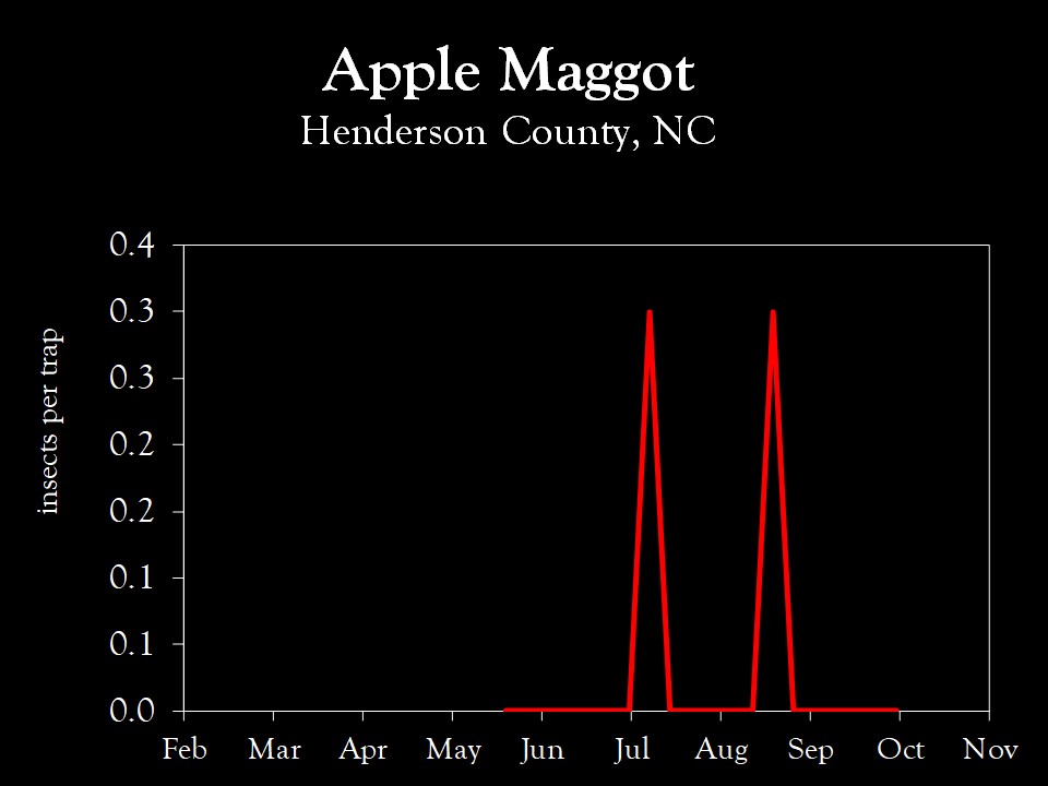 Finally, apple maggot populations in Henderson County remain very low. However, populations can vary considerably among locations. In fact, Doug Hundley reported high captures of flies during the past few weeks on red sphere traps in Avery County orchards at elevations of about 3500 ft. It should be noted that orchards located at elevations greater than about 2700 ft have consistently had higher populations than lower elevation orchards.